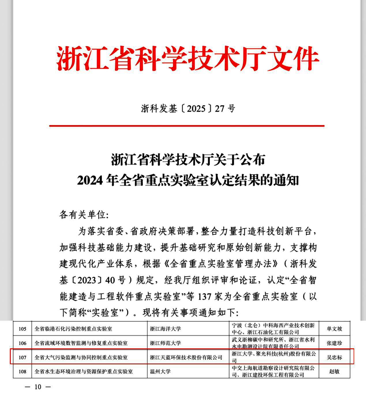 2025年6月4日,浙江省科技廳發(fā)布《浙江省科學(xué)技術(shù)廳關(guān)于公布2024 年全省重點實驗室認(rèn)定結(jié)果的通知(浙科發(fā)基〔2025〕27號)》,由浙江天藍環(huán)保技術(shù)股份有限公司牽頭,浙江大學(xué)和聚光科技(杭州)股份有限公司共建的“全省大氣污染監(jiān)測與協(xié)同控制重點實驗室”獲批組建,成為全省環(huán)境領(lǐng)域唯一以企業(yè)牽頭建設(shè)的省級重點實驗室。